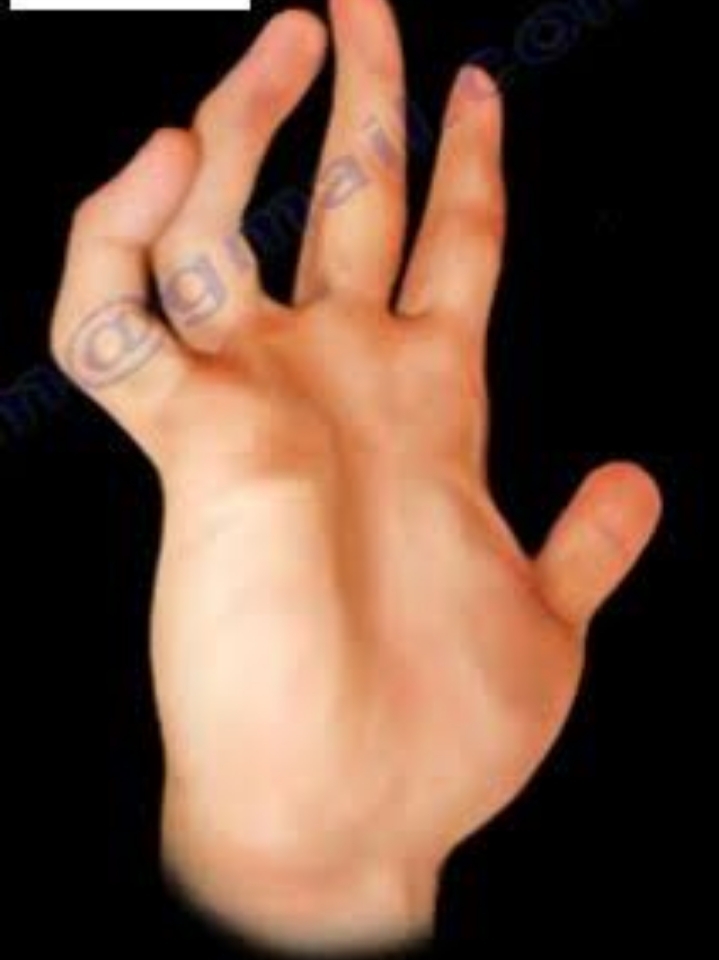 A hand imitating an ulnar claw. The metacarpophalangeal joints of the 4th and 5th fingers are extended and the Interphalangeal joints of the same fingers are flexed.